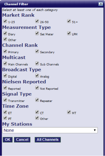 This represents all the channels provided by TiVo. All Channels includes areas not measured by Nielsen (outlying U.S. territories) and channels in measured areas that are not reported by Nielsen (see non-reported channels below). Currently, TRAC Media Services receives schedules for all channels reporting PBS as their primary or secondary affiliation as well as any independent stations which run at least some public television content.